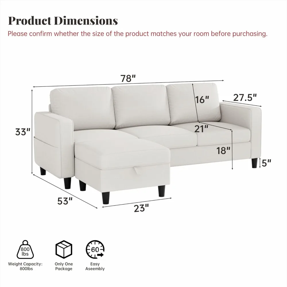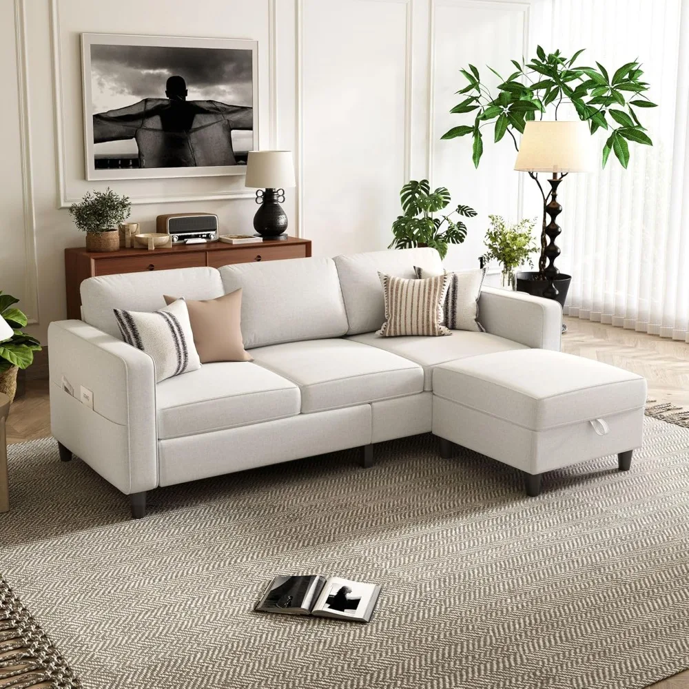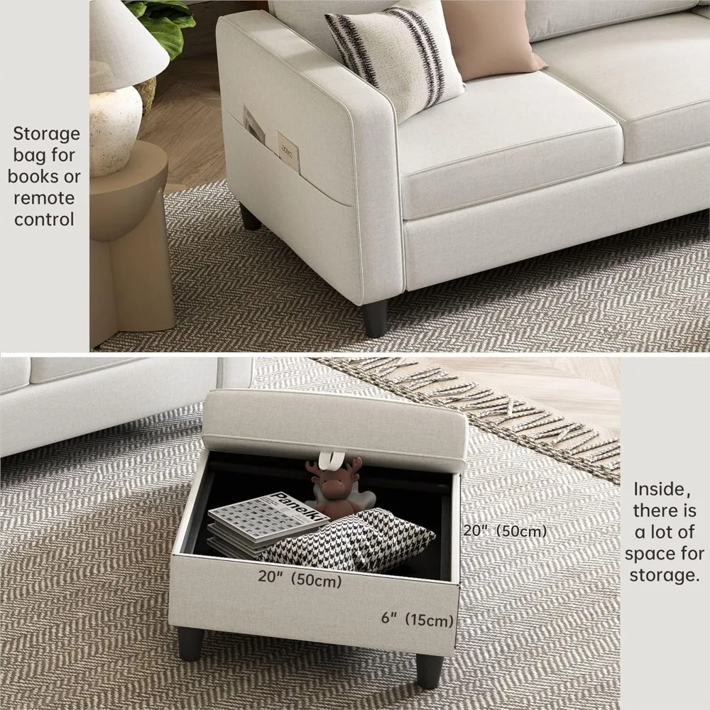 - 【Tips for Saving Space】On this sectional sofa, you just need to lift the cushion on the ottoman gently, and a practical storage space will be opened up. Meanwhile, there is a storage bag on each side of the armrest. Whether it’s TV remote controls, various magazines and books, or pillows, blankets, toys and other items, they can all be easily stored in it, which is both convenient for daily access and greatly improves the space utilization rate. It’s really practical and convenient.